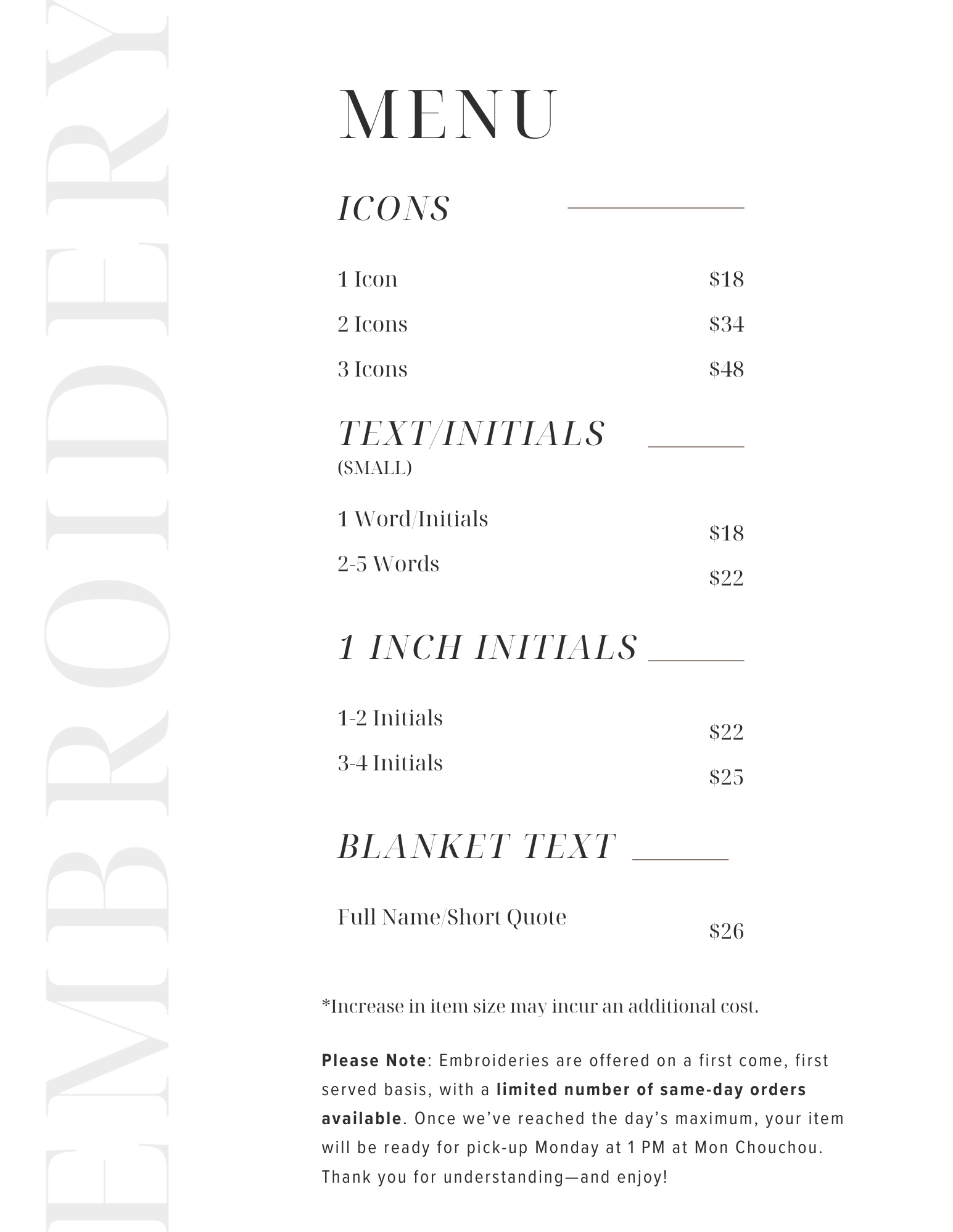 Before your appointment, please review our Embroidery Guidelines, which outline the items eligible for embroidery. Feel free to reach out with any questions—we’re happy to help!